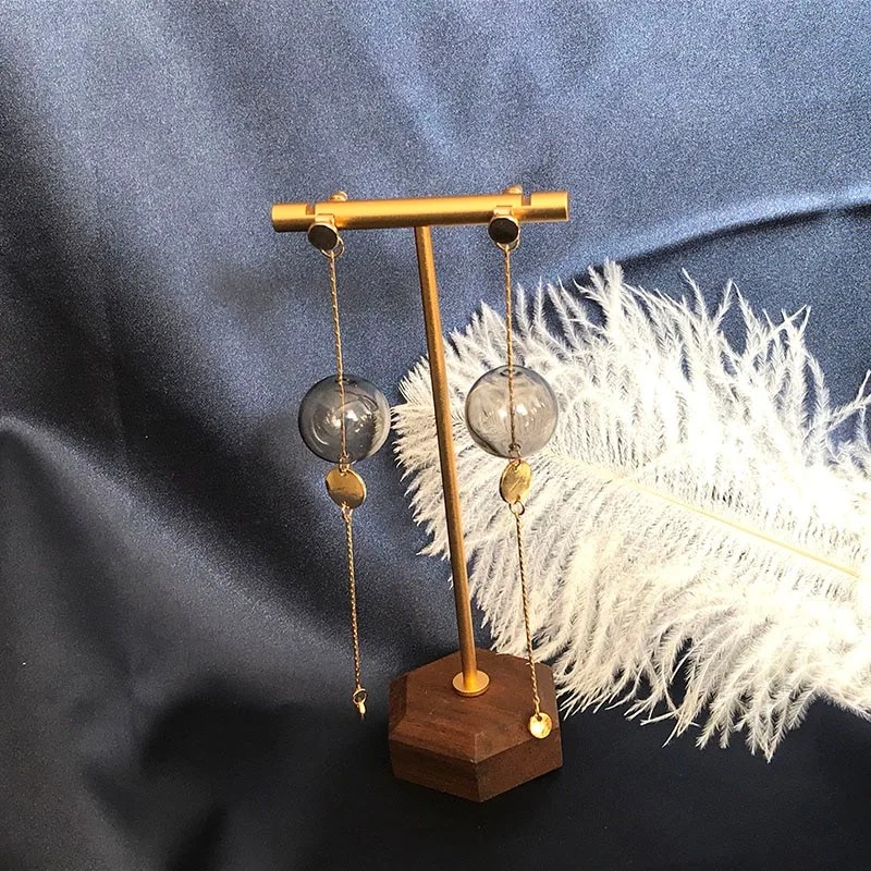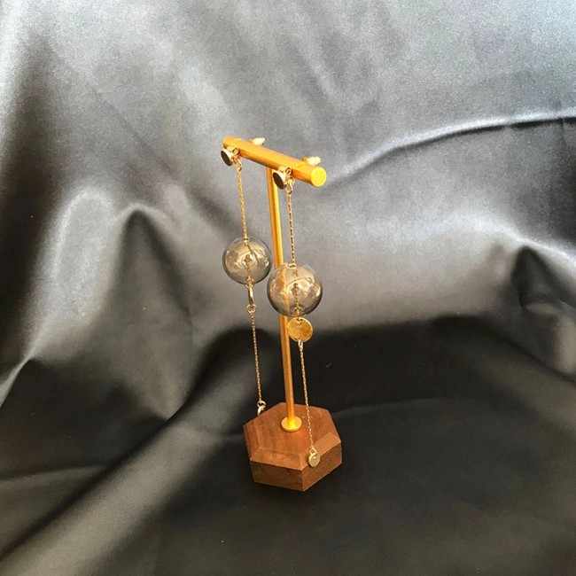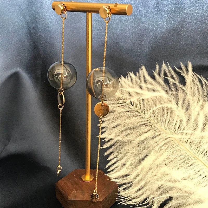 Leur bulle transparente aux reflets fumés capte la lumière avec délicatesse, suspendue à une fine chaîne dorée ponctuée de petits disques métalliques.