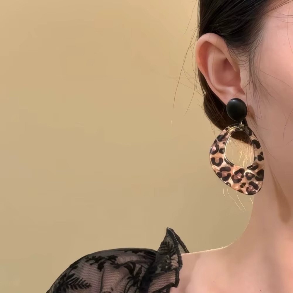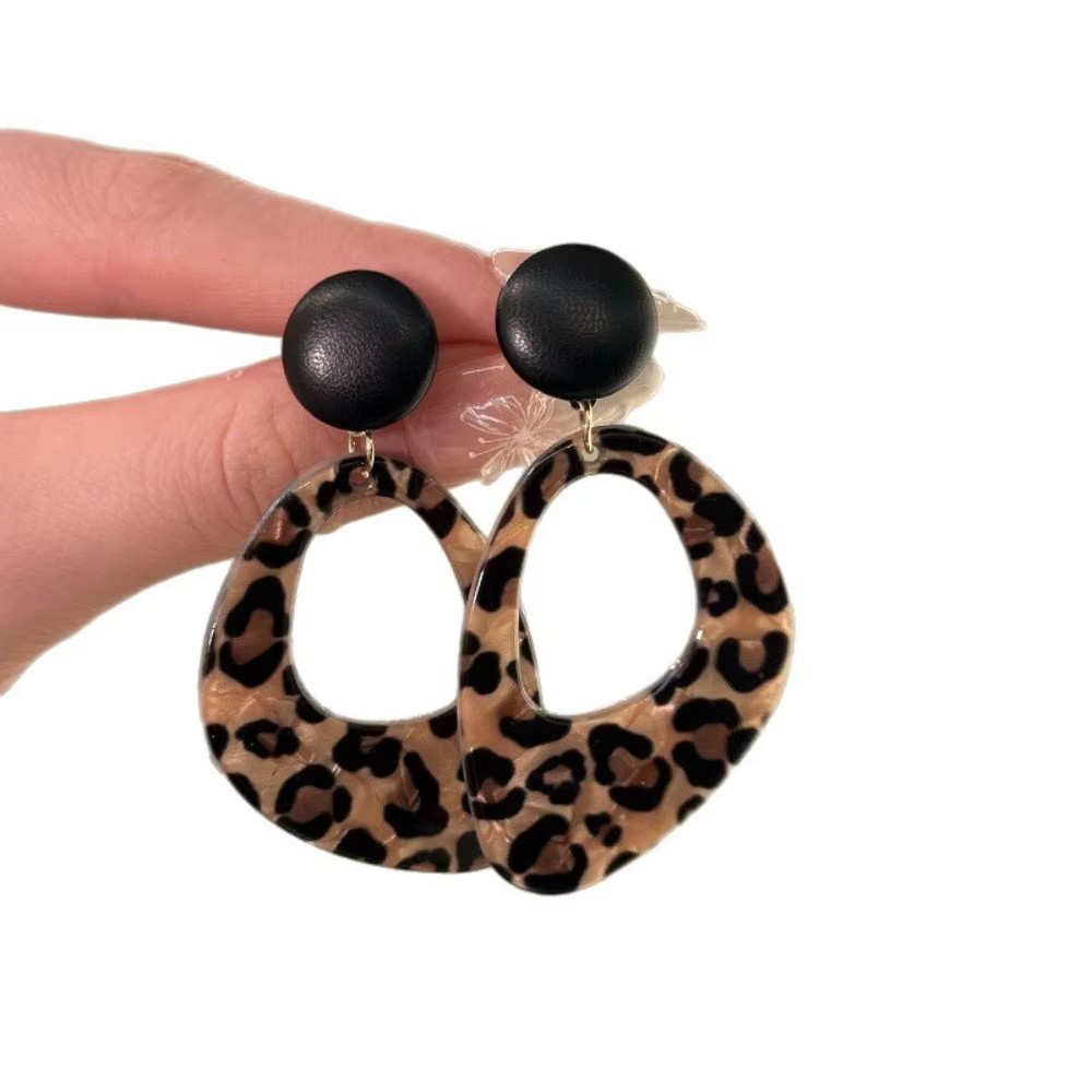 Ces boucles d’oreilles au motif léopard séduisent par leur design graphique et leur mélange de matières : un médaillon en acrylique imprimé associé à une pastille ronde recouverte de cuir (ou simili cuir).